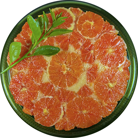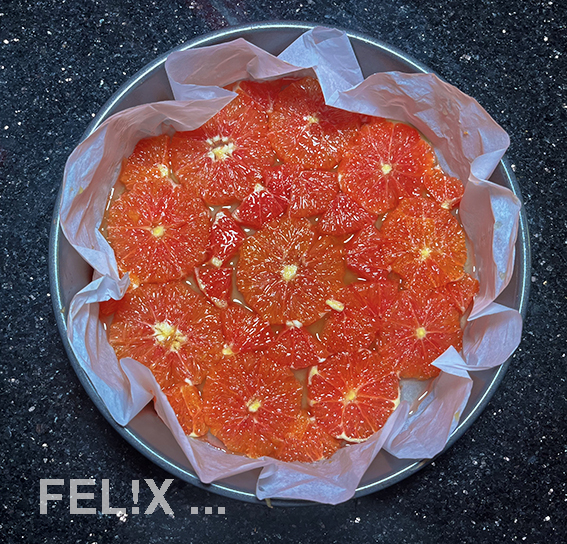 Es muss auch kein Zucker karamellisiert werden: er geliert hier mit dem Saft der Orangen. Und anstelle eines Mürbeteigs kommt ein Rührteig zum Zug, so dass die Orangen zum Schluss auf einem feinporigen Biskuit liegen.