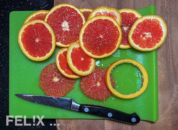 • Schale mit einem scharfen Messer streifenweise dick abschälen, so dass auch die weisse Innenhaut entfernt wird. Dann in Scheiben schneiden.