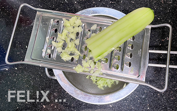 1Gurke schälen, längs halbieren, entkernen und grob in ein Sieb raspeln (Rösti­raffel).