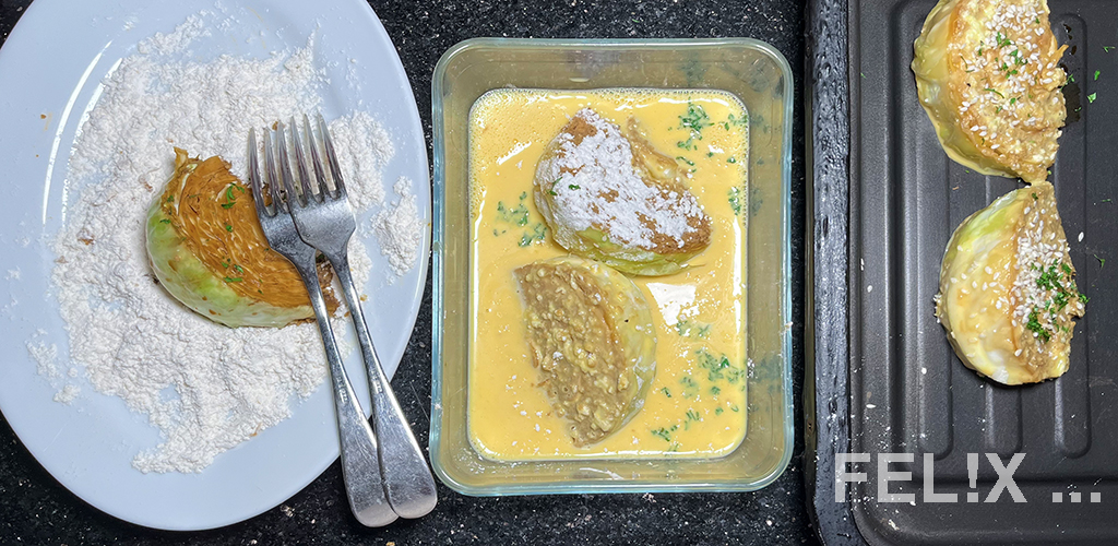 Marinierte Kohlspalten erst im Panko-Mehl wenden, dann in der Ei-Mischung.