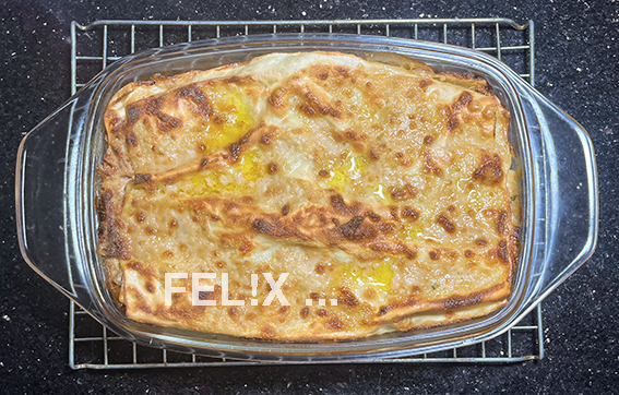 10 Minuten in der Küche stehen lassen: die Lasagne ist erstens sehr heiss und lässt sich dann zweitens besser in Portionen (= Lasagna!) schneiden.