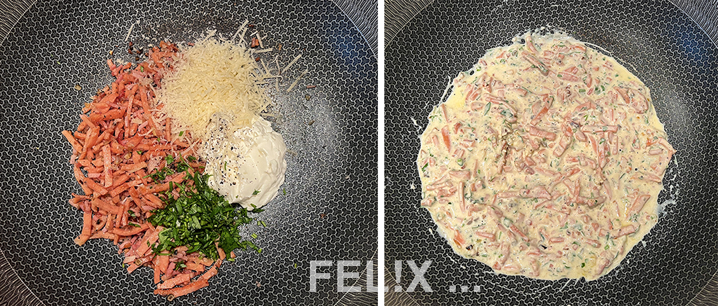 Pfanne vom Feuer nehmen, Frischkäse und Kräuter beigeben, Parmesan dazureiben.