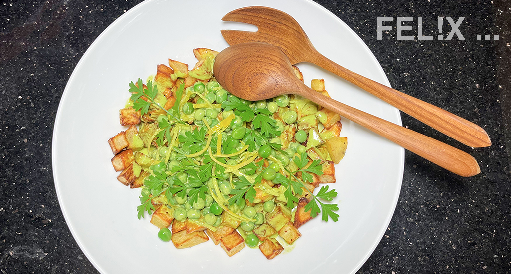This is a really nice take on potato salad — I love how they look coming from the air fryer, something which I don’t yet have. And the combination of the peas, lemon and creamy dressing? Just perfect.