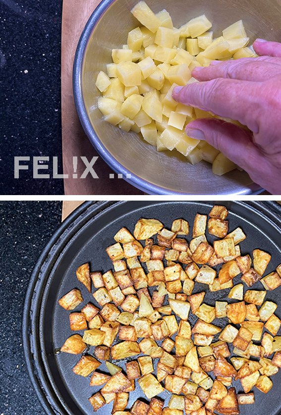 Entweder in der Heissluft-Fritteuse bei 180 °C (oder in einer beschichteten Pfanne) zu schöner Farbe braten.