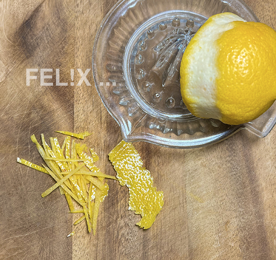 Zitronenschale mit dem Sparschäler fein abziehen, in zündholzfeine Streifen schneiden.