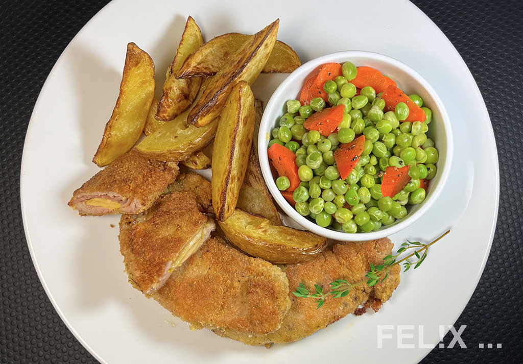 Währenddessen die Beilagen vor- und zubereiten: bei mir gab es grüne Erbsen mit Karotten und Kartoffelspalten aus der Heissluft-Fritteuse.