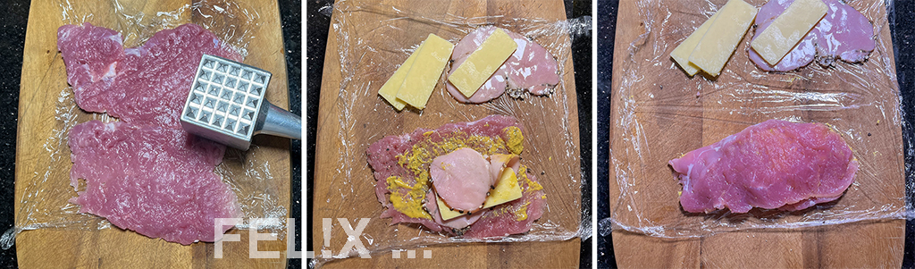 Fleisch zwischen Klarsichtfolie leicht plattieren, es sollte nicht zu dünn werden (Fleischklopfer oder Pfannenboden).
