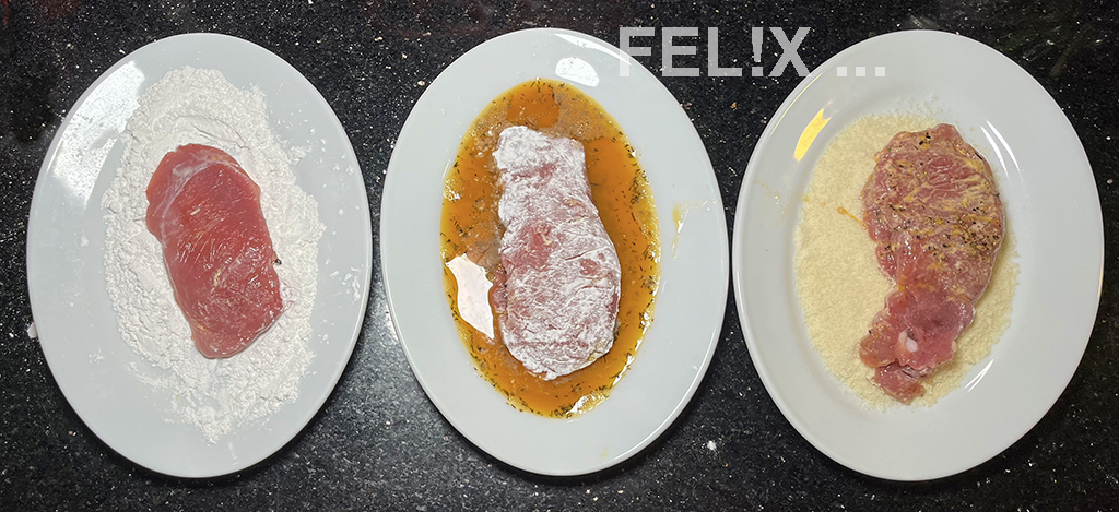 Mehl und Brösel in 2 weiteren Schalen verteilen.