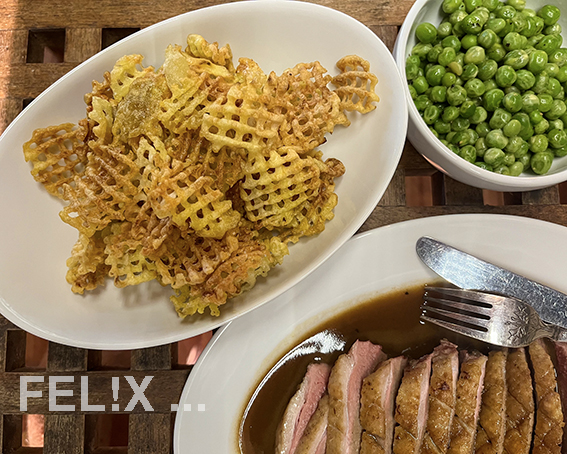 Wieder einmal habe ich die Waffel-Kartoffeln zubereitet. Und eine Entenbrust. Und frische Erbsen in Butter.