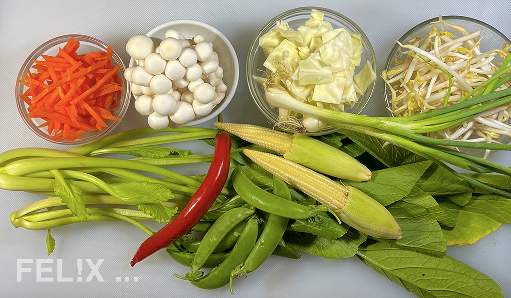 Karotten, Erbsenschoten, Chinesischer Broccoli (Kai-lan/Phak khanaa), Weisskohl, Baby-Maiskölbchen, rote Peperoni oder Peperoncini, Pilze, Frühlingszwiebelchen, Mungbohnensprossen, usw.