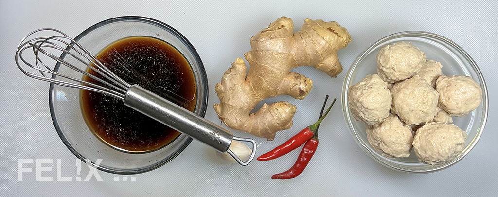 • 6–8 (ca. 150 g) thailändische Fleischbällchen «Luk chin muu», siehe hier!
