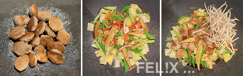 Ein paar von den selbstgemachten thailändischen Fleischbällchen habe ich zu Beginn gebraten und zum Schluss dem Gemüse beigefügt.