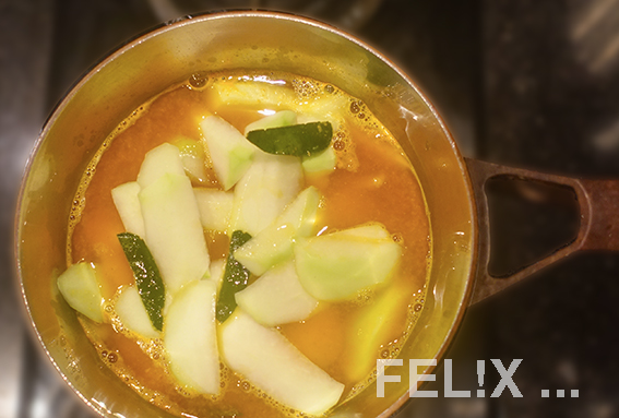 Papaya-Scheiben dazugeben, nicht ganz zugedeckt köcheln lassen, bis die Papaya fast gar, aber noch knackig ist, was je nach Dicke der Scheiben 8–15 Minuten dauert.