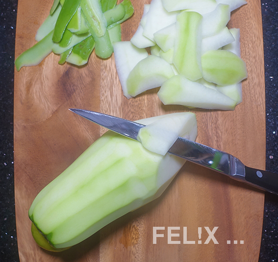 2Die Papaya schälen. Kalt abspülen, um den milchigen Saft zu entfernen, der dabei entsteht.