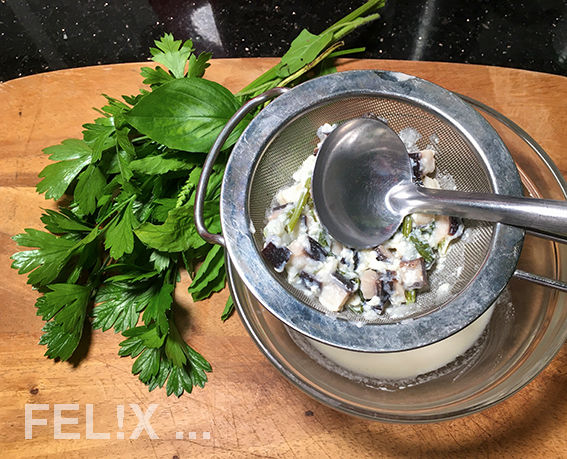 Aromatisierte Milch in ein Sieb geben, mit der Rundung eines Löffels gut ausdrücken, auch was an der Unterseite des Siebs haftet abstreifen.