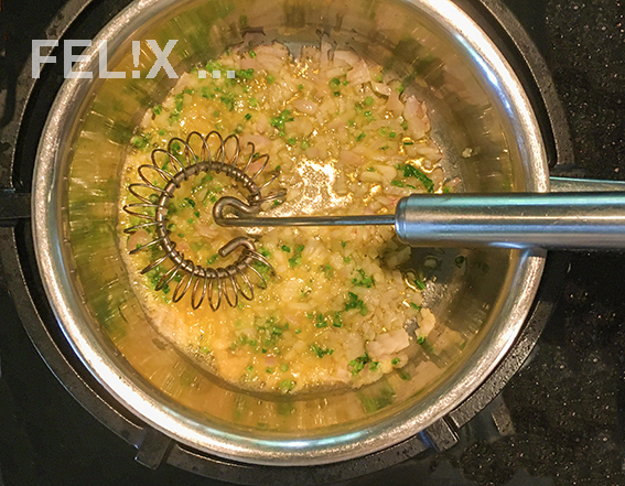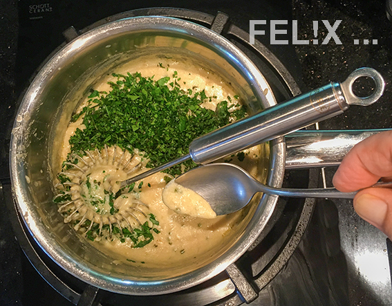 Käse dazureiben, mischen. Die Sauce soll recht dickflüssig werden.