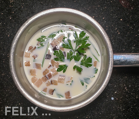 Speckwürfel und in Stücke geschnittene  Petersilie mit der Milch erhitzen.