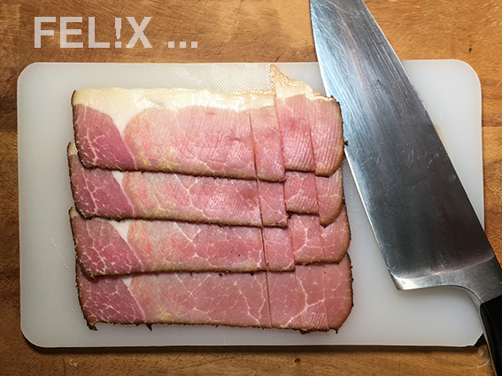 • 50 g gut geräucherter Speck [FEL!X: Schinken­speck], in nicht zu dünnen Tranchen