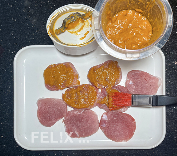 Auf einem Tablett beidseitig mit der Marinade bepinseln.