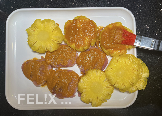 Die 8 Ananasscheiben darauflegen, ebenfalls mit der Marinade bestreichen. Zugedeckt mindestens 1 Stunde marinieren (länger: im Kühlschrank).