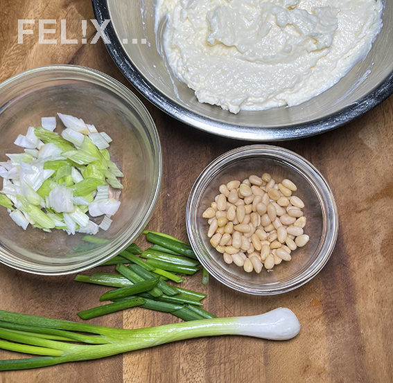 • Pinienkerne und gehackte Frühlingszwiebelchen darüber verteilen