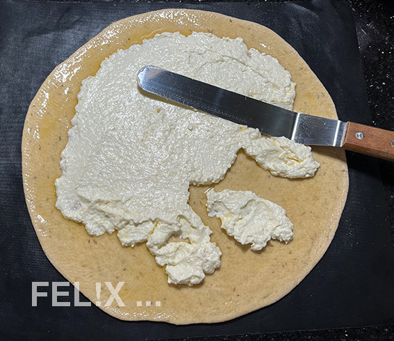 • Die Ricotta-Masse gleichmässig daraufstreichen, dabei einen Rand freilassen.