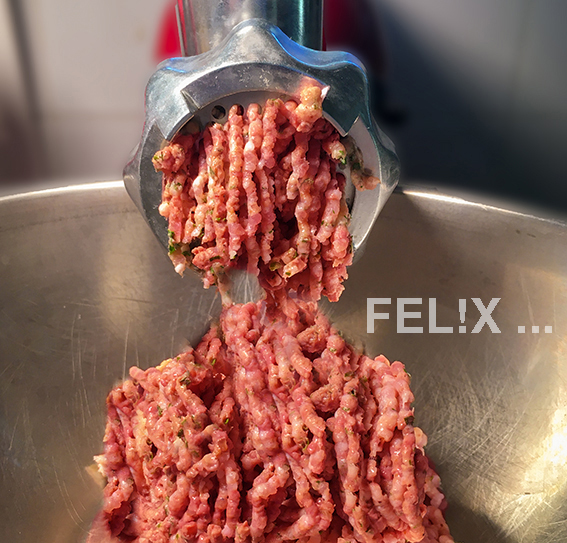 Ich habe das Fleisch samt 50 g Frühstücks­speck durch den Wolf gedreht und mit den weiteren Zutaten gemischt (= ca.350 g).