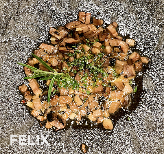 Samt gehackten Rosmarin­nadeln und etwas Thymian in wenig Öl dünsten.