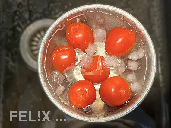 Tomaten in kochendem Wasser 20–30 Sekunden blanchieren.