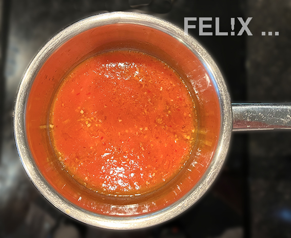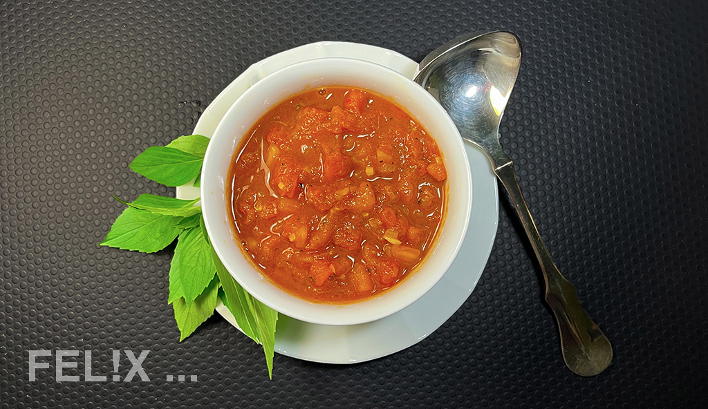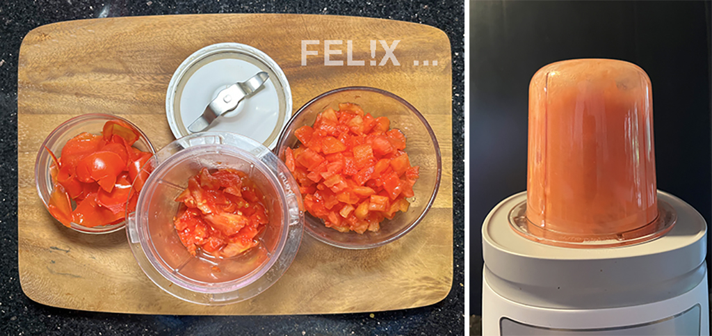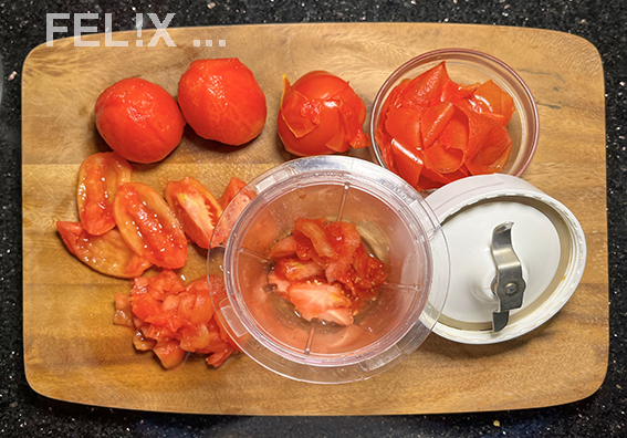 • das Mixen von Tomatenfleisch und -kernen in dieser relativ kleinen Menge geschieht am besten in einer Kräutermühle oder in einem kleinen Mixer