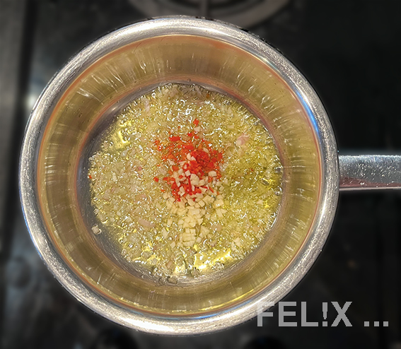Schalotte, Knoblauch und Chili hacken, im Öl kurz anziehen.