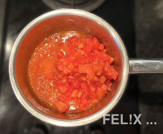 Schliesslich auch die Tomatenwürfel beigeben. Unter Wenden nur kurz köcheln lassen, abschmecken (= ca. 250 g Sauce).