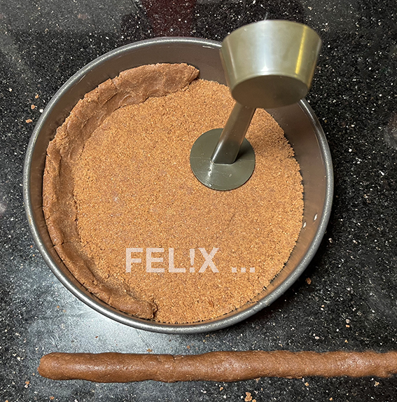 250 g davon auf dem Formenboden verteilen, mit dem «Stopfer» der Espressomaschine (oder mit einem Glas mit geradem Boden) gleichmässig flachdrücken.