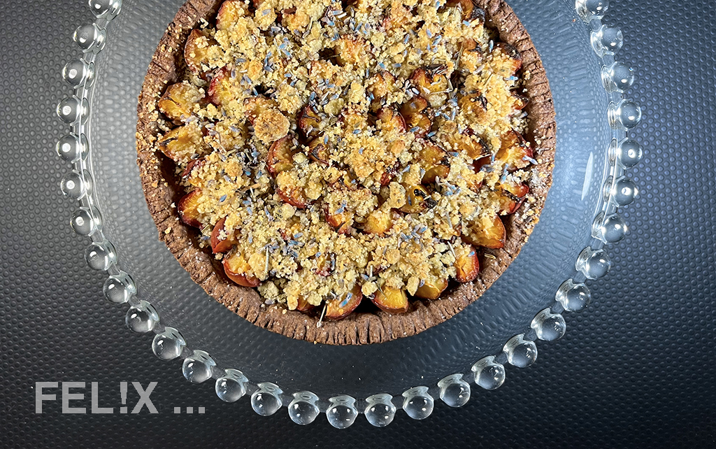 Auf einem schokoladigen Mürbeteig – der übrigens nicht ausgewallt werden muss! – und mit Lavendel-Streuseln gebacken: