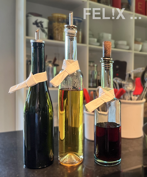 Beispielsweise mit aufgesetzten Ausgüssen für verschiedene Öle. Dunkel für Olivenöl, helle Flasche für Reisöl. Und für Essig.