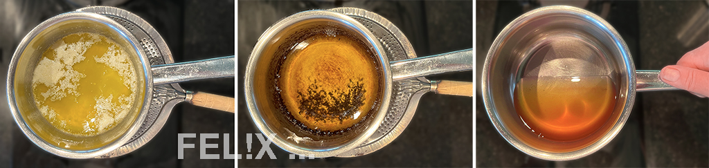 Butter in einem Edelstahlpfännchen auf kleinem Feuer schmelzen. Sanft köcheln lassen, immer wieder mal umrühren, bis sich ein Bodensatz bildet und die Butter honigfarben-hellbraun wird.