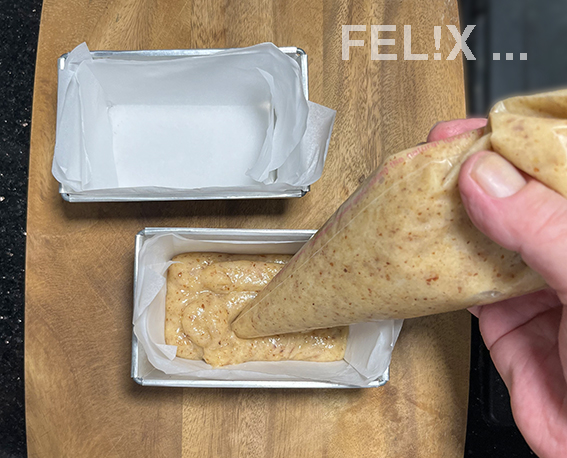 Eine Spitze wegschneiden und die vorbereiteten Formen nur etwa 2 cm hoch befüllen (Kastenformen: 4×85 g oder Formenblech: 8×45 g), es sollen ja eine Art Barren, keine hohen Kuchen entstehen.