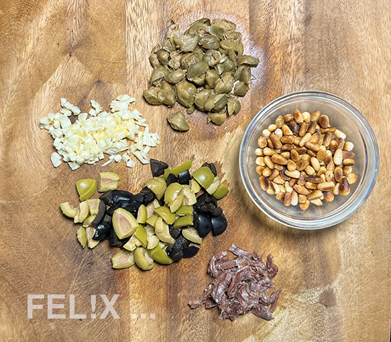 Oliven grob hacken, ebenfalls die abgetropften Kapern und die Sardellen.