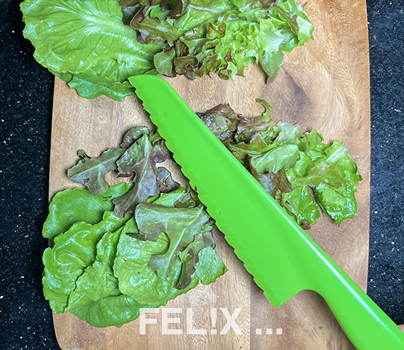 In grobe Stücke zupfen oder mit einem Salatmesser (= Plastik) samt den Blattrippen in Streifen schneiden (das ergibt eine grosse Schüssel voll!).