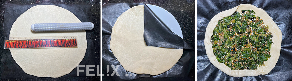 Auf Backfolie ca. 35 cm rund auswallen (nur die Oberseite leicht mit Mehl bestäuben).
