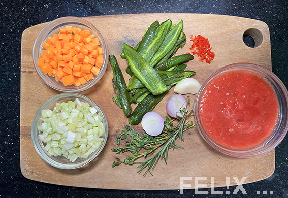 Begonnen mit den Karottenwürfelchen (die brauchen länger, als das weitere Gemüse!) im Öl andünsten, gefolgt von Sellerie, dann Schalotten und Chili, schliesslich Knoblauch und Kräuter.