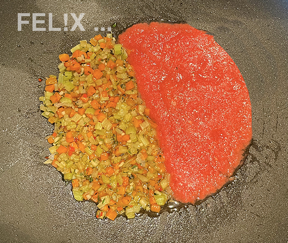 Pürierte Tomaten beifügen, zu einer sämigen Gemüsesauce köcheln lassen. Es soll noch Flüssigkeit vorhanden sein, allenfalls wenig Wasser dazugiessen.