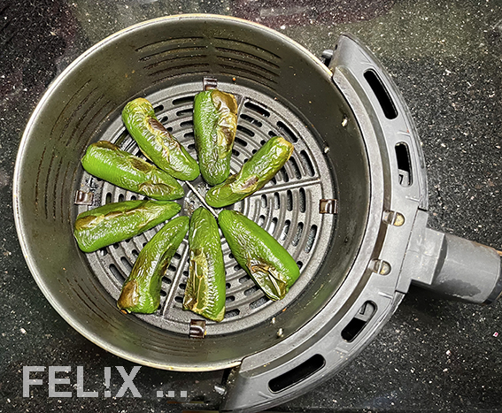 Schälen: entweder in der Heissluft-Fritteuse, oder im Backofen – siehe hier unter Peperoni schälen!