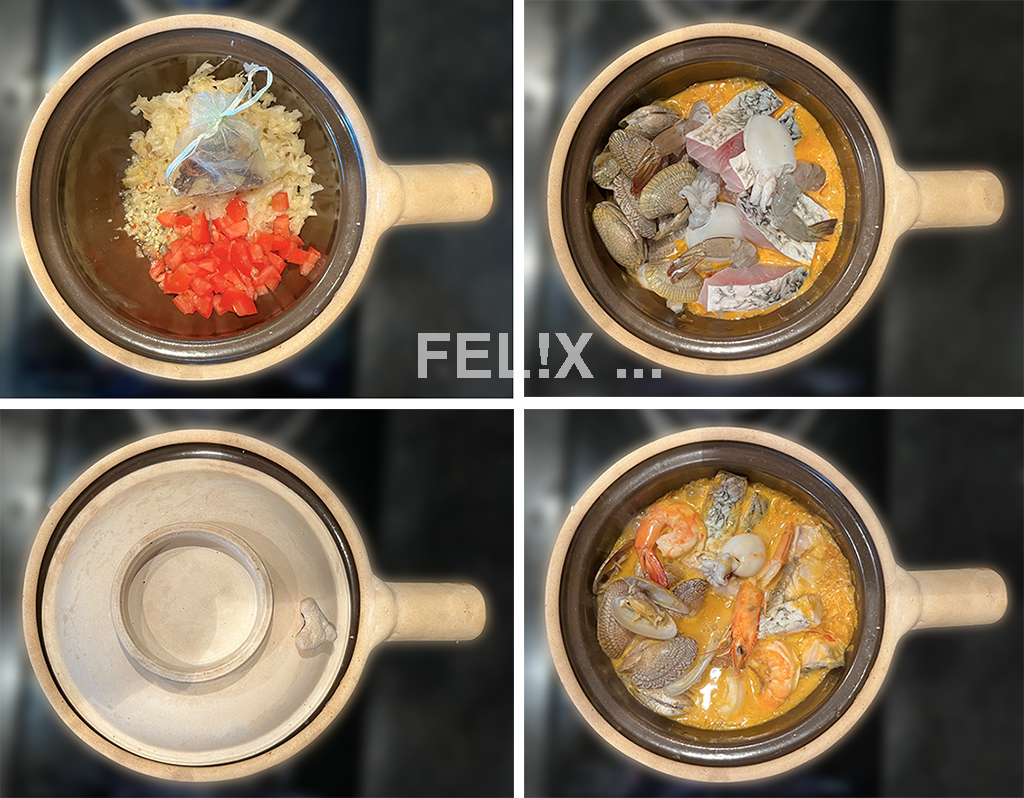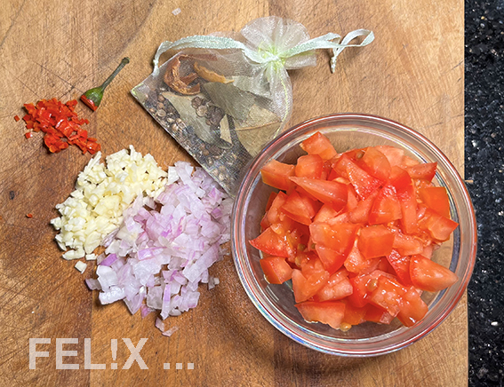 Falls frisch: Fischfilet in Stücke schneiden (wichtig: mit Haut, damit sie nicht zerfallen), von Garnelen Köpfe und Schalen bis auf das letzte Segment entfernen (= Tail-on), Sepien je nach Grösse wie hier beschrieben vorbereiten, Muscheln gut wässern und spülen.