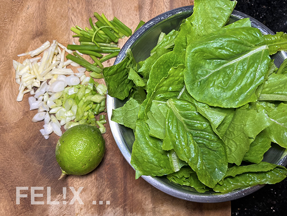 Lattich waschen, trockenschleudern, lange Blätter in grobe Stücke reissen.