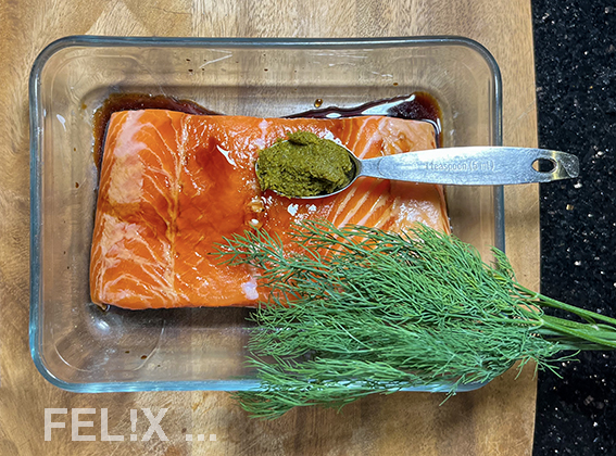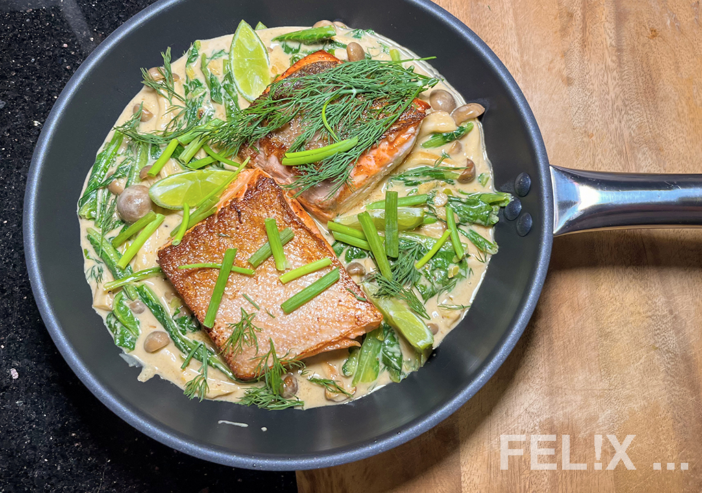 Salmfilets und Limettenspalten dazugeben, mit dem Frühlingszwiebel-Grün und weiterem Dill bestreut direkt in der Pfanne servieren.