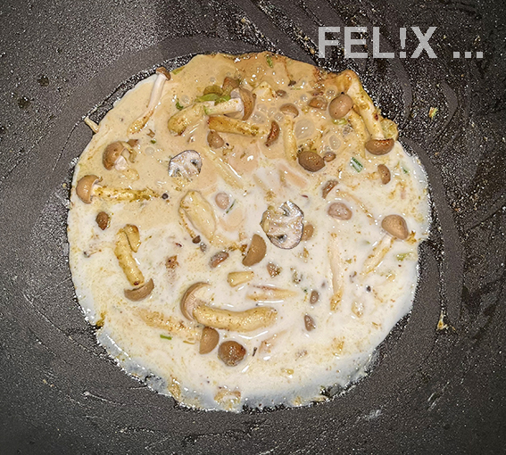 Pilze samt Curry-Paste, Knoblauch und den weissen und hellgrünen gehackten Zwiebelchen im verbliebenen Öl gut anziehen.