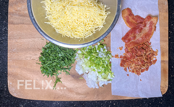 50 g vom Käse und die Hälfte der Speck-Mischung darunter rühren.