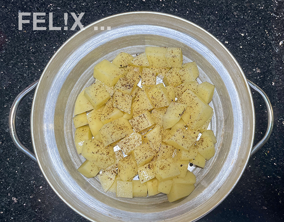 Kartoffeln schälen, grob gewürfelt und leicht gewürzt im Dampf gut weichgaren.