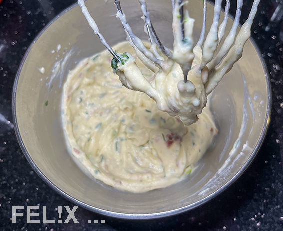 Rahm und so viel Milch dazugeben, bis eine cremige, keinesfalls zu dicke Masse entsteht.